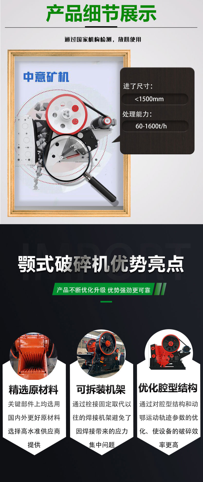 在關(guān)鍵部件上均選用質(zhì)量過(guò)硬的的原材料(如前/后墻、側(cè)墻板、顎板、軸承座、動(dòng)顎體、主軸等),選用高水準(zhǔn)制造商提供的關(guān)鍵零部件(如軸承、聯(lián)軸器等)。